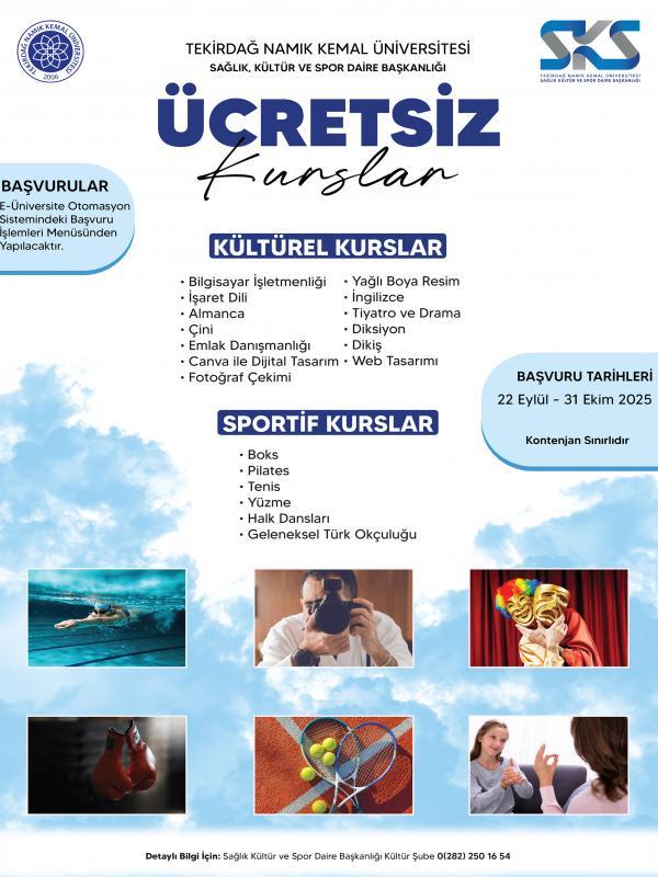 Üniversitemiz Sağlık, Kültür Ve Spor Daire Başkanlığı Bünyesinde Ücretsiz Kurslar Düzenlenecektir.